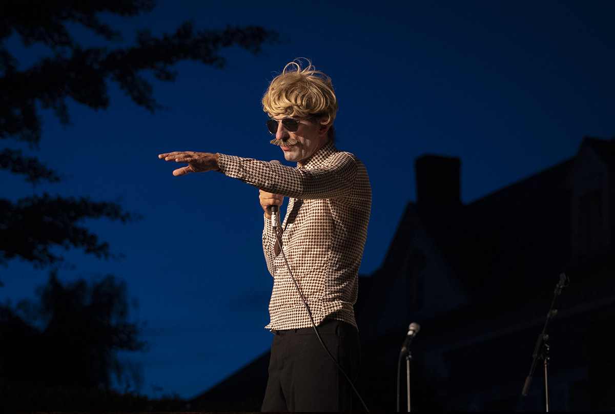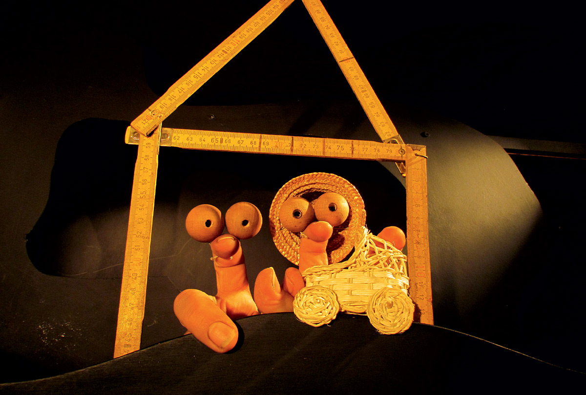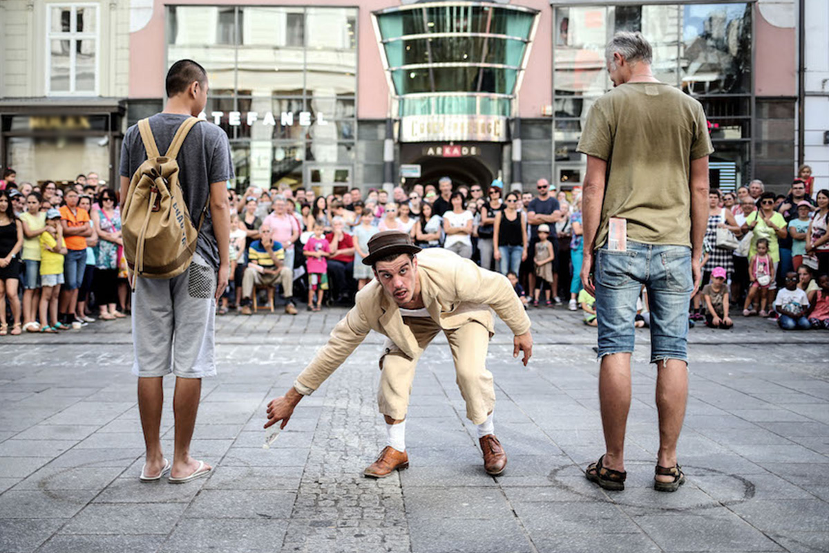 Un homme, immobile, dans un tourbillon de passants qui traversent une place de village…Clap…Action ! Depuis la posture, les actions, les attitudes de ceux qui marchent ou qui attendent quelqu’un, des histoires sans fin, des gags et des improvisations sont créés, ce qui transforment ce lieur de passage statique en un petit théâtre sans chaises ni rideaux…Clap…Action ! Deux hommes et une femme du public deviennent les acteurs d’une histoire d’amour interdite, un clap, de la jonglerie excentrique et des équilibres inattendus. C’est le mariage ! Un spectacle en interaction continu avec tout ce qui vit, végète, naît ou habite ce lieu et ce moment.